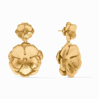 A tribute to nature's beauty, the Julie Vos Bloom Statement Earrings feature a sculpted floral design with romantic golden blossoms. Each earring is adorned with a petite companion flower, adding movement and elegance. Crafted in 24k gold plating, these dramatic, dangling earrings catch the light beautifully, making them an ideal choice for those who love statement jewelry with a feminine, organic touch. Perfect for both special occasions and everyday wear, they bring a touch of romantic charm and timeless beauty to any outfit.