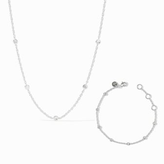Add an understated touch of elegance to your special occasion wardrobe with the barely-there sparkle and shine of this silver, cubic zirconia-accented necklace and bracelet. Pure silver plate (tarnish-free), CZ. Closes with lobster clasp. Necklace Length: 16.5 / 17.5 inches (adjustable). Bracelet Inner circumference: 6.3 / 6.8 / 7.3 inches (adjustable). Width: 0.1 inches. Julie Vos hallmark.