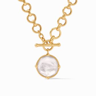 This demi-sized version of a favorite necklace has two ways to wear: Show the rose cut stone accented with golden beads or flip it to display a detailed bas relief bee. 24K gold plated 19" Chain, with two ways to wear it. One side shows a rose cut, Iridescent Clear glass stone accented with golden beads, The flip side displays a detailed bas relief bee. Pendant measures 1.09 inches.