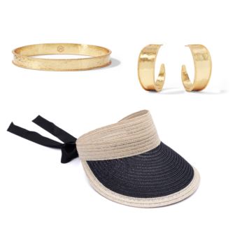 Whether it is a day out on the boat or a shopping day this Julie Vos X Eugenia Kim accessory bundle will be the perfect set for a stylish and effortless look. Starting with the Savoy bangle and hoops. Both 24K gold plated and lightly hammered for texture. They are both elegant and subtle in design. Bangle: 2.6 inches. Hoops: 1.75 inches. Add the final touch with The Ricky Vented Hemp Visor. Offering a stylish and comfortable way to enjoy sun protection. Made with natural, breathable vented hemp, it features a sleek black vented hemp bill for added flair. A black grosgrain bow adorns the design, adding a touch of elegance to this practical accessory. Its adjustable one-size design ensures a comfortable fit for all-day wear. It's a compact and chic addition to any wardrobe. Visor: One size (adjustable). Visor Dimensions: H 4.5" X W 10" X L 11.5". Visor Crown Height: 2.75", Brim Length: 4.50".