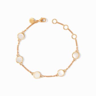 Introducing the Valencia Delicate Bracelet: a timeless adornment crafted to capture hearts. Delicately entwined along its slender chain are five luminous mother-of-pearl stations, each a testament to elegance and grace. With its understated beauty and undeniable charm, this bracelet is more than just an accessory-it's a symbol of love, whispered sweetly with every glance. Embrace the allure of romance and grace your wrist with the Valencia Delicate Bracelet. Adjustable length 6–6.5–7 inches. 24K gold plate.