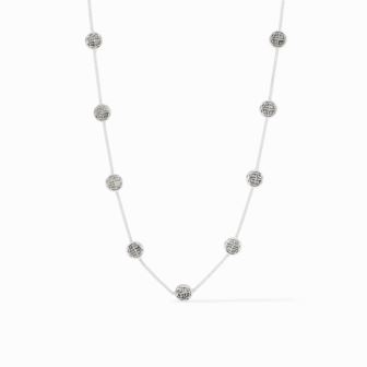 Nine delicate silver coin stations on a fine chain. Pure silver plate (tarnish-free). Length: 16.5 / 17.5 inches (adjustable). Closes with lobster clasp. Multi-use wear. Julie Vos hallmark.
