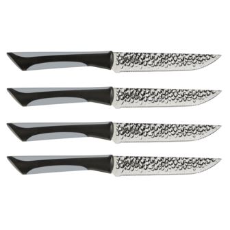 Set includes 4 serrated steak knives with black soft-grip handles. High-carbon, high-chromium German DIN1.4116 stainless steel blades. Molded resin handles are lightweight and contoured for comfort. Double bevel cutting angle 16 degrees each side. The sharpest knives out of the box. (5-Year Warranty). Shun is hottest selling gourmet knife brand in the country.