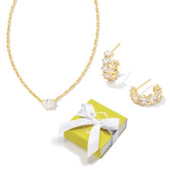 It's your time to shine! Elevate your look for a special occasion or everyday glam with this Cailin Gold Crystal Set. This set includes the timeless Cailin Gold Pendant Necklace in White Crystal. Crafted from 14K yellow gold over brass with beautiful white crystal. 16" Chain with 3" extender, 0.37"L X 0.24"W Pendant. Pair this with the Cailin Crystal Huggie Earrings - the perfect pairing for a full-glam look. 14k Gold Over Brass. Ear Post Closure. 0.53" Outside Diameter.