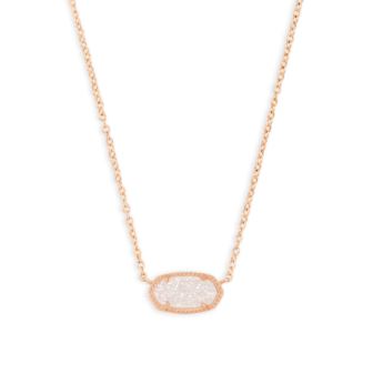 This enticing well rich sparkling appearance with a dainty stone and delicate metallic chain combine to create the Elisa Rose Gold Pendant Necklace in Iridescent Drusy, your new favorite wear-anywhere accessory. This pendant necklace can be paired with any look, providing that extra touch of timeless style. 14k Rose Gold Plated Over Brass Size: 0.63"L x 0.38"W stationary pendant, 15" chain with 2" extender Lobster claw closure, Material: iridescent drusy.