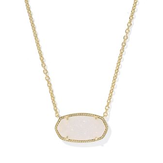 Bigger, bolder, and more beautiful than ever: meet the Elisa Statement Gold Iridescent Drusy Short Pendant Necklace. With a size inspired by our archival Dylan Pendant Necklace, this Elisa is a maximalist take on our bestselling icon, featuring gorgeous stone faceting and our signature hoofprint detailing. Try pairing her with an Elisa Short Pendant Necklace or a Mini Elisa Short Satellite Pendant Necklace in a coordinating color for a look that's all in the family. 14.1" Chain with 3" Extender. 1.01"L X 0.56"W Pendant. Metal: 14k Yellow Gold Over Brass. Material: Iridescent Drusy. Closure: Lobster Clasp w/ Single Adjustable Slider Bead.