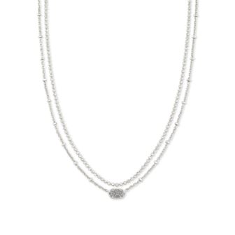 Pull off an effortlessly layered look in the Kendra Scott Emilie Multi-Strand Necklace in Platinum-Tone Drusy. Mini versions of Kendra Scott's most iconic silhouettes and delicate chains put us in the freshly-showered-sun-soaked-warm-kind of mood. This rhodium-plated brass necklace measures 15.5 inches in length with a 3-inch extender.