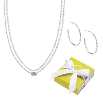 Achieve an effortlessly layered look with the Emilie Multi-Strand Necklace in Platinum-Tone Drusy, featuring mini versions of Kendra Scott's iconic silhouettes and delicate chains. This rhodium-plated brass necklace measures 15.5" in length with a 3" extender, perfect for embracing that freshly-showered-sun-soaked-warm vibe. Pair it with the beautiful Veronica Hoop Earrings. A classic silhouette and subtle sparkle in silver. A wardrobe staple, these weightless hoop earrings effortlessly dress up the everyday. With the Veronica Hoop Earrings in your jewelry box, you'll always have the perfect accessory for any outfit. Rhodium Plated Over Brass Size: 1.7" outer diameter Material: Iridescent crystal. Both pieces elevate your ensemble effortlessly. This set arrives in a Kendra Scott Signature Yellow Gift Box with a white bow, making it perfect for gifting.