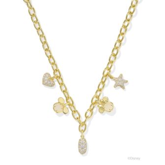 Make your look totally charming with the Disney - Kendra Scott Gold Mickey Mouse and Minnie Mouse Charm Necklace in Iridescent White Mix. This necklace features a mix of charms, including Disney's eternal sweethearts and some of our most iconic Kendra Scott shapes. With its bold chain and top-notch sparkle, this one is a total must-have. Metal: 14k Yellow Gold Over Brass. Size: 17"L, 0.48"W. Includes 3"L Extender.