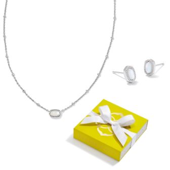 Add this elegant and beautifully coordinated set to your jewelry collection! Featuring the Mini Elisa Silver Satellite Short Pendant Necklace and the Mini Ellie Silver Stud Earrings, both in timeless Ivory Mother of Pearl. Our bestselling icon goes daintier (and cuter!) than ever in the Mini Elisa Necklace, perfect for a more minimal aesthetic. Pair with Mini Ellie Silver Stud Earrings; petite iterations of our signature shape, framed by our classic hoofprint detailing. This delicate duo offers a soft, iconic look. Necklace: set on a textured 15" satellite chain with a 4" extender, showcases a 0.39"L x 0.21"W pendant. Earrings: 0.31"L x 0.21"W.