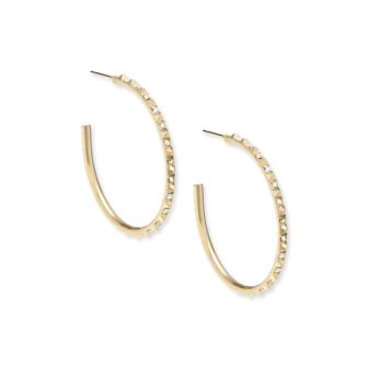 This dazzling pair of Veronica Hoop Earrings in Gold. A wardrobe staple, these weightless hoop earrings effortlessly dress up the everyday. With the Veronica Hoop Earrings in your jewelry box, you'll always have the perfect accessory for any outfit. 14K Gold Plated Over Brass, Size: 1.7"outer diameter. Material: Iridescent crystal.