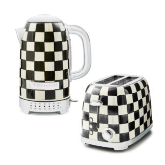 The Courtly Check Electric Kettle has us bubbling over with excitement. Featuring our most iconic check pattern on sleek stainless steel, you can turn an everyday essential into a statement piece. Designed for both function and flair, it's the perfect way to bring color and charm to your kitchen. Let's have a toast to appliances that are anything but ordinary with this Courtly Check 2-Slice Toaster! Designed to bring color, pattern, and fun to your kitchen, this stainless-steel toaster features our most iconic check pattern, making it the perfect addition to your MacKenzie-Childs collection. Pair it with more pieces from the Courtly Check collection, or mix and match with our other beloved patterns to create a kitchen that brightens the everyday. Toaster: 6.5" wide, 7.5" tall, 10.5" deep, 1.25" slot width. Electric Kettle Dimensions: 5" dia., 8.5" wide, 11.5" tall, 8 cup capacity.