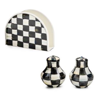 The Courtly Check Napkin Holder & Shaker Set includes the perfect accessories for your next hosting occasion. When it comes to staying tidy, our Courtly Check Enamel Napkin Holder makes table manners and table style a snap. Our most popular pattern is casual and cozy, with a subtle jewel-tone palette woven through the glossy, hand-painted, high-contrast checks. Durable enough to take outside for a picnic. Spice up your table with Courtly Check Enamel Salt & Pepper Shakers included, rendered in our signature black-and-white pattern that complements any kitchen decor. With a subtle jewel-tone palette woven by an artisans brush through the glossy, hand-painted, high-contrast checks, we've yet to find a color (or food!) that doesn't look good with Courtly Check. Shakers Dimensions: 2.5" dia., 3" tall (each). Napkin holder: 2" wide, 6" long, 4.5" tall.