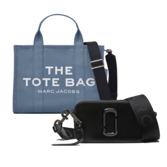 Make it your best fashion day, every day with this fun bag duo! This set includes The Medium Traveler Tote in the stunning Blue Shadow color. The most classic version of our Medium Tote brings style to your every day with a quintessential Marc twist. Crafted from textural cotton canvas. Medium canvas tote features screen printed logo and top zipper closure. Interior zip pocket. Adjustable, removable webbing strap. Made of Cotton. Dimension 13in L x 6in D x 11in H. Strap Drop 27in. Handle Drop 5in. Need a more compact bag but just as stylish? This set has you covered with the included Snapshot bag in the versatile color Black. A small camera-style bag in Saffiano leather with an adjustable cross body strap. Features: TM (dyed-to-match). Double-J hardware. Dual top zip closure. Interior and exterior slip pockets. Removable and adjustable webbing strap. Dimensions: 7" L x 2.25" W x 4.25" H. Strap Drop Length 25.5".100% Split Cow Leather With PU Coating.