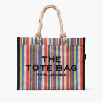 Utilitarian, yet elevated. This beach-ready bag makes the everyday feel extraordinary. This iconic tote is inspired by Marc archives and is for so much more than errands. Made from striped rainbow mesh material with leather trim and detailing. Knotted rope top handles make for easy carrying. A top zip closure keeps everything safe. Inside, find one zip pocket and two slip pockets. Dimensions: 13.39in H x 6.69in W x 16.54in L