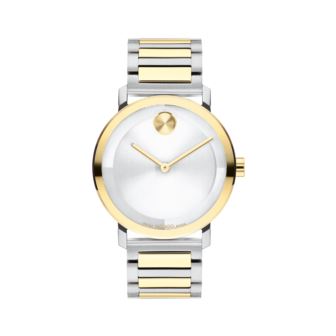 Movado BOLD Evolution 2.0 Men's. The evolution of modern design with a sharp look and elevated feel. This mix-metal timepiece is crafted from stainless steel and pale yellow goldtone ion-plated stainless steel. It features a statement-making 40mm case that houses a captivating micro-textured silvertone dial with a glossy lacquer overlay, slim goldtone hands, and our iconic dot motif at 12 o'clock. A flexible matching mix-metal H-link bracelet completes the design.