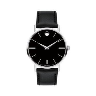 Movado Classic Museum, Gents. 40mm Stainless Steel Case. Black dial with silver dot & Silver Markers. 21mm Black calfskin Strap. Tongue Buckle. Sapphire crystal. Water resistant to 99 feet. 2 Year limited warranty.
