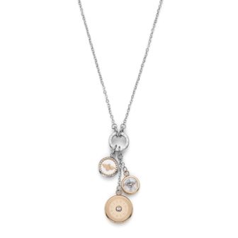 Prepare to be charmed by our vintage-inspired collection. This Stainless Steel/Rose Gold-Plated pendant necklace features a trio of beautifully detailed charms. Each charm represents a treasured motif for our brand, including a playful bee with caviar-bead border, a North Star set on faux mother of pearl and a crystal-set disc with ribbon etching. Hung at various heights the charms can be removed