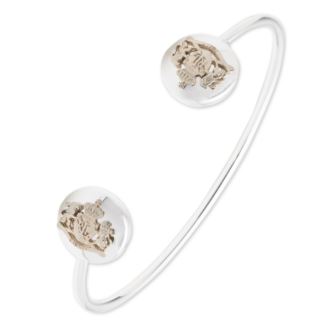 Silver bracelet with gold RLL crest. Open cuff styling. One size fits most.