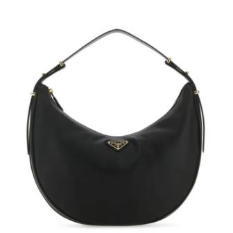 The Prada Large Leather Shoulder Bag in Black is a sophisticated and spacious accessory, crafted in Italy from smooth calfskin leather for a luxurious finish. Its clean, structured silhouette is accented with the iconic Prada lettering logo in gold-tone metal. A secure zip closure, designed without magnetic components, protects your belongings while maintaining a sleek profile. The interior features a single open pocket for quick access to essentials. Measuring 15" W × 4.5" D × 14" H and weighing approximately 1.8 lbs, it offers generous capacity without compromising elegance. This versatile design is perfect for work, travel, or everyday use.