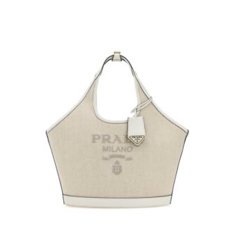The Prada Sand Canvas Handbag in Sand offers a blend of casual elegance and functional design. Crafted in Italy from sturdy canvas, it is accented with smooth leather trim and the signature Prada lettering logo on the front. Its open-top construction allows easy access to essentials, while the structured shape maintains a polished look. Measuring 13.80" W × 6.30" D × 10.20" H and weighing approximately 0.85 lbs, it is spacious enough for everyday use yet lightweight for comfortable carrying. The unlined interior keeps the bag light and versatile, making it perfect for both casual outings and warm-weather wear.