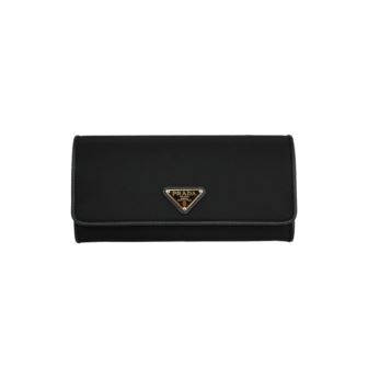 The Prada Tessuto Long Wallet with Pass Case in Black is a sleek and functional accessory, crafted in Italy from the brands signature Tessuto nylon with saffiano leather trim for added durability and elegance. Accented with the iconic Prada lettering logo in gold-tone metal, this long wallet combines style with practicality. Inside, it features multiple card slots, bill compartments, and a removable pass case for added convenience. The design is secured with a full zip-around closure, keeping contents organized and protected. Measuring 7.5" W × 0.8" D × 3.9" H and weighing approximately 0.4 lbs, it is both lightweight and spacious enough to carry daily essentials.