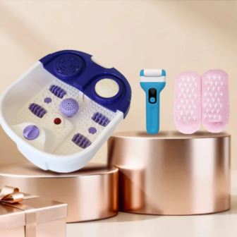 Bring the spa home with the all-in-one Prospera Ultimate Foot Spa Set. This complete system combines a heated foot spa with massage rollers, a dual-speed electric foot smoother, and moisturizing spa socks to help relax muscles, remove calluses, and restore softness. Designed to improve circulation and rejuvenate tired feet, it delivers a full at-home foot care routine in one easy-to-use set.