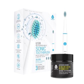 Set includes: USB Rechargeable Rotary Toothbrush with 40,000 VPM high vibration. Features a 2-minute timer with 30 second reminder and 5 cleaning modes - white, clean, sensitive, polish and massage. It is USB rechargeable and includes 3 brush heads. Activated Coconut Charcoal Whitening Powder (2 oz.) is infused with grapefruit, peppermint and lemon essential oils. Whitens teeth with no sensititvity. Apply a small amount of powder to moist toothbrush and brush for 2 minutes.