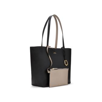 With a removable zip pouch and a reversible design, this vegan leather tote offers double the versatility for work and the weekend. Two top handles, each with a 10" handle drop. Dog clip closure. "Lauren Ralph Lauren" embossed at the center front. Removable "LRL"-engraved D-ring. Removable zip pouch at the interior.11" H x 16" L x 5" D.