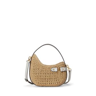 Meticulously hand-crocheted with straw and trimmed with supple full-grain leather, the small Tasha bag captures Ralph Laurens iconic spirit with an equestrian-inspired D-ring and a modern, curved asymmetrical silhouette. With both a top handle and a removable, adjustable crossbody strap, this piece offers multiple styling options. Leather top handle with a 5" drop. Removable, adjustable leather crossbody strap with a 23" maximum drop. Magnetic snapped closure. D-ring tab at the front. Brass-finished rivet custom-developed with an "LRL" logo. Shell: paper straw. Trim: leather. 7.75" H x 7.75" L x 2" D.