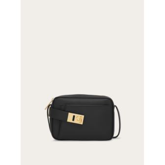 Original and snappy, this chic compact camera case is full of contemporary charm with unique features. On the front, a folding pocket is sealed by a strap that wraps from the back with Gancio clasp, while the top zip opening reveals a fully organized interior. Featuring a tonal piping around the edge, the soft calf leather is sumptuous and luxurious. Adjustable shoulder strap. Shoulder strap length:21". 5.1" H x 9.4" L x 2.7" W. Made in Italy.