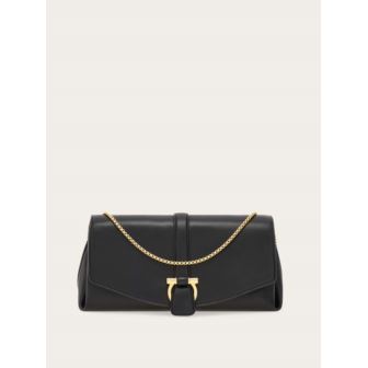 Effortlessly chic and easy to carry, this new Ferragamo cross body is a lesson in contemporary style. Cut from sumptuous Italian calfskin with a semi-gloss finish, the leather is punctuated by a golden Gancini clasp on the front flap. At the sides, custom golden tabs shape the bellows whose outline echoes the lily, the symbol of Florence. Carry as a clutch, shoulder bag or wear cross body with the adjustable, removable strap and golden chain. Height 6.2 IN X Length 12.2 IN X Width 4.3 IN. Made In ITALY.