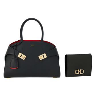Elegant and convenient, this Ferragamo set features two timeless essentials crafted in premium calfskin. The top-handle bag is designed with retro-inspired lines, natural-grain calfskin panels, and a bold contrasting interior. It includes an asymmetrical back, front Gancini buckles, and a detachable, adjustable shoulder strap (21.5" length). Paired with a hammered calfskin French wallet, the duo balances sophistication and function. The wallet features an antique gold Gancini buckle, organized interior with bill compartments, card slots, and a snap-button coin pocket. Bag Composition: Calfskin. Shoulder strap length: 21.5 in. Wallet Composition: Hammered Calfskin. Wallet Dimensions: L 4.40" x W 0.30" x H 3.50".