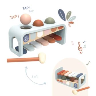 This all wooden Xylo "bench" is colorful, durable and safe with no rough or sharp edges. It includes three balls which your little one can hammer down into the slots and slide on the wooden xylophone under. This fun toy helps your toddler acquire logic, coordination, and cognitive ability. This toy is crafted from sustainably sourced wood from FSC® certified forests and coated with non toxic paint.