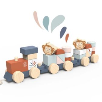 A fun wooden pull-along train stacker, painted in trending soft colors and featuring our favorite character, the monkey. Your little one will have hours of fun, stacking elements on the train and building houses with colorful blocks. Once everyone on board, tchu tchu off goes the train for a new adventure! This toy is crafted from sustainably sourced wood from FSC® certified forests and coated with non toxic paint.