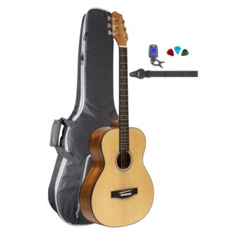 The Stagg Acoustic pack has everything you need to start your guitar odyssey!! Featuring the SA25 Acoustic guitar with traditonal dreadnaught styling, Spruce top, walnut compensated bridge, die-cast chrome tuners, and open pore finish for maximum resonance. Pack also includes deluxe padded gigbag, guitar strap, clip on tuner, and picks.