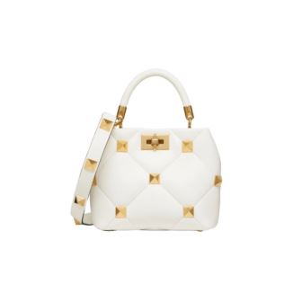 The Valentino Garavani Roman Stud Mini Top Handle Bag in ivory is a refined accessory that seamlessly blends elegance with a touch of edge. Crafted in Italy from premium lambskin leather, this structured bag features the iconic Roman Stud embellishments that add a distinctive flair. The design includes a detachable leather handle and a detachable sliding chain strap, offering multiple carrying options-be it on the shoulder, crossbody, or as a handbag. The turn-lock closure secures the leather-lined interior, which includes a slip pocket for organization. With its compact dimensions and sophisticated design, this bag is perfect for both day and evening occasions. Dimensions: 11 L x 9 W x 4 H, 1.8 lbs