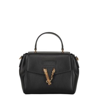 Sleek and sophisticated, the Versace Virtus Crossbody Bag in Black is crafted from premium pebbled calfskin and adorned with the signature gold-tone Virtus “V" emblem inspired by classical Barocco detailing. This Italian-made piece features a structured silhouette with a magnetic flap closure, offering both security and style. The adjustable and detachable leather shoulder strap provides versatile crossbody wear, while the top handle allows for elegant handheld carrying. A spacious interior with a slip pocket keeps essentials organized, making it ideal for daily wear or elevated evening looks. Measuring approximately 11.4" L x 9.8" H x 5.1" D and weighing about 2.4 lbs, this crossbody brings classic luxury with modern functionality.