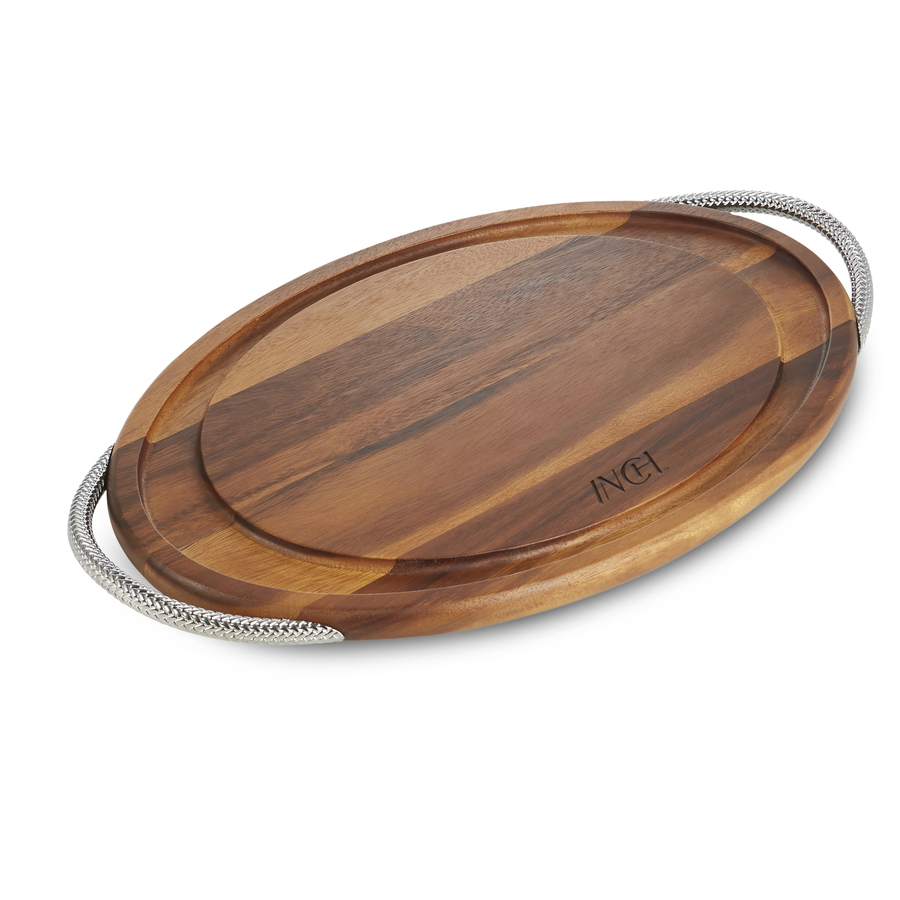 Beautiful acacia wood combines with the intricate braid detail of the chrome handles on the Braid Carving Board. Its subtle moat design catches running juices as you carve meats of all kinds, making this piece a must-have entertaining essential and a wonderful wedding gift.