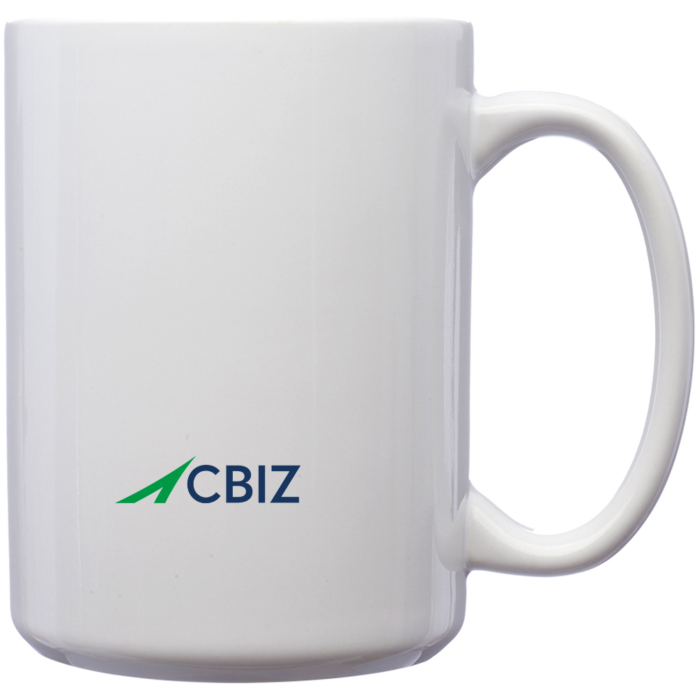 Large 15oz mug with smooth molded ceramic composite. Glossy interior with matching color interior. Easy comfort grip c-curve handle. Features our brand.