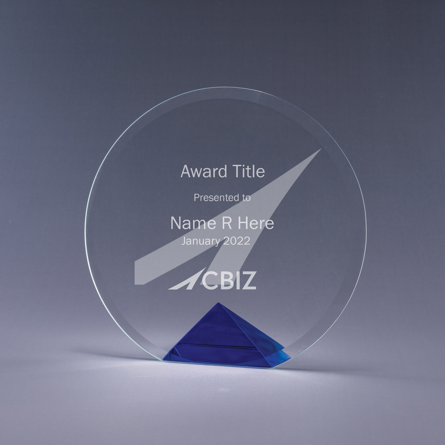 The circle made interesting! The use of color and an angled triangular base adds presence to your message. The circle is made from beveled Starphire Crystal whose aqua tint is accented with blue on the base.