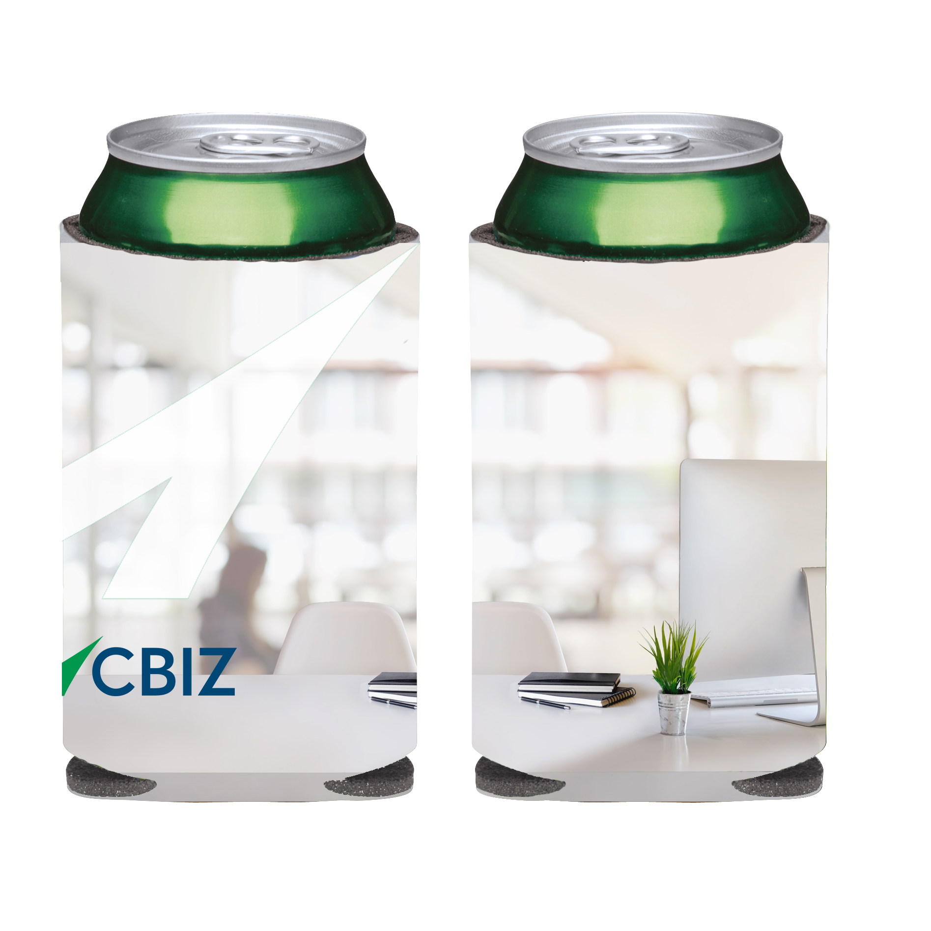 Folding polyester can kooler with foam backing features our brightly colored brand! 3.875" tall.