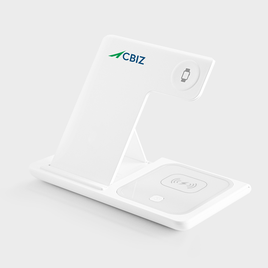 Experience the convenience of the LED Wireless Recharging Station! Designed around a blazing fast 15 watt Qi charging phone stand that features our brand, this item also includes a built in Apple Watch charger, a charging station for any Qi earbuds and a LED light. Truly an all-in-one design that makes the perfect gift. Packaged in a white tuck box (6.75"H x 7"W x 6/8"D). Prop 65 certified.