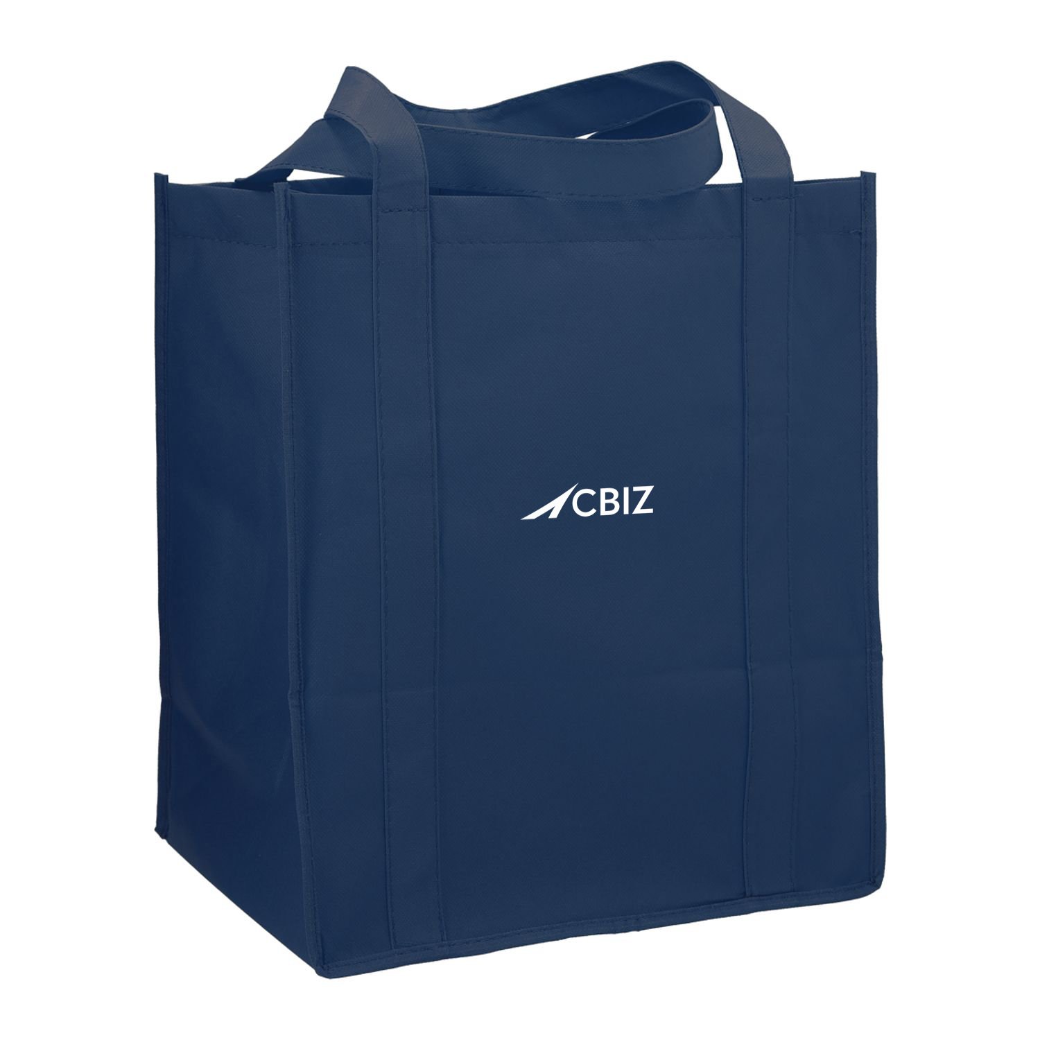 The Little Juno Non-Woven Grocery Tote features an open main compartment with double 22" reinforced handles and a supportive bottom board to hold your items securely. Constructed from recyclable polypropylene materials, this reusable tote is an environmentally responsible alternative to plastic bags.
