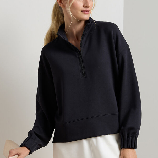 An easygoing layer you'll want to live in every day, this half-zip pullover is made from a custom-developed, sublimely soft stretch jersey fabric with a plush, midweight feel. An updated streamlined design allows for easier layering. Features: Women's 77% Modal / 16% Polyester / 7% Spandex pullover. Machine wash cold with like colors; lay flat to dry.