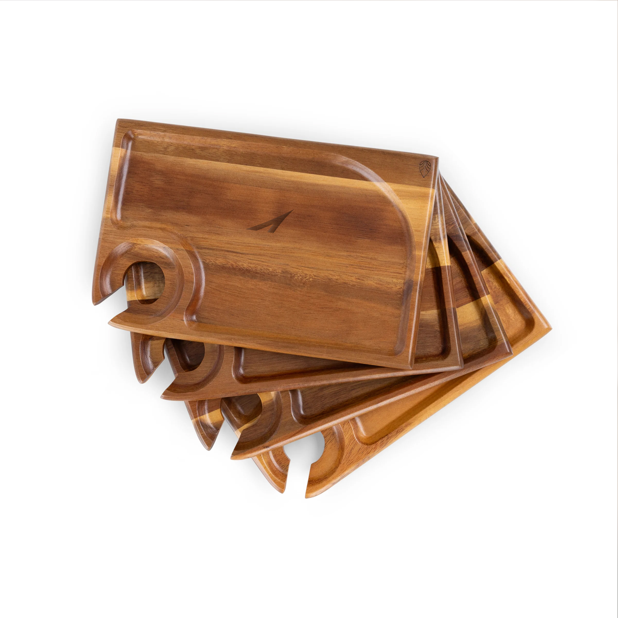 Yes, we understand you only have 2 hands. The Wine Appetizer Plate Set of 4 is made to share with friends. Don't be greedy! Wood tray with ridged edges to secure small bites. Features our brand and personalization is available.