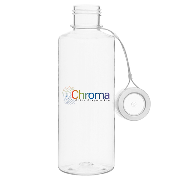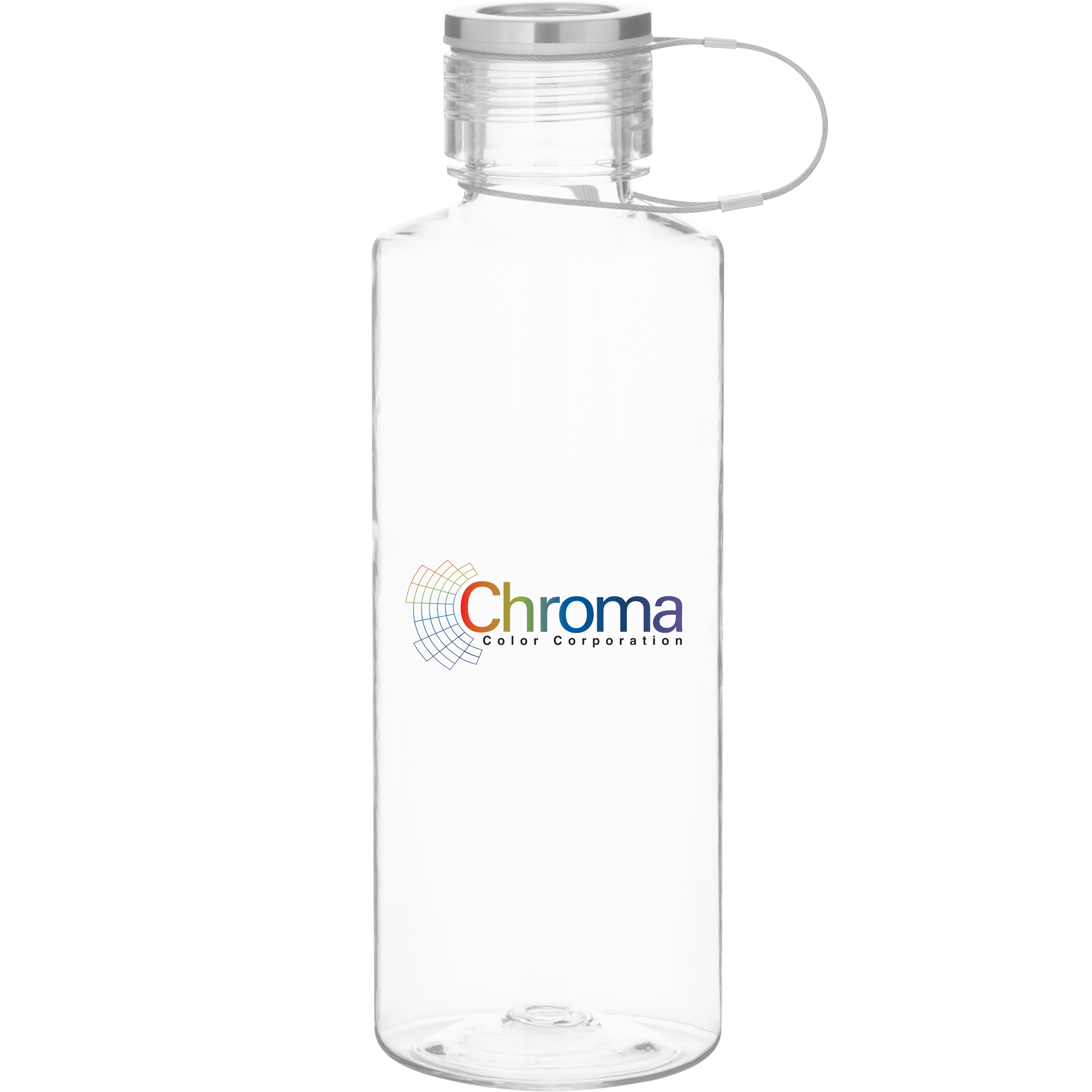 25 oz single wall [BPA-free] Eastman Tritan copolyester bottle with threaded lid, stainless steel accent, and braided coated wire carrying loop. 9" x 3".