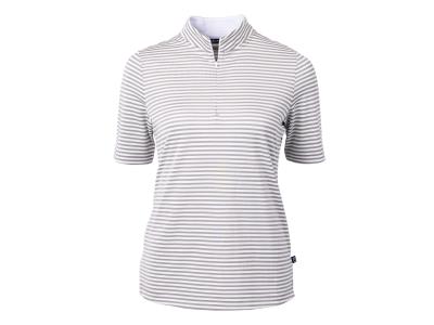 The iconic Cutter & Buck Virtue Recycled Stripe Featherlight Pique Womens Half Zip is engineered for exceptional versatility, designed to be your favorite sustainable womens striped top for golf, office, WFH, travel, recharging, and for a night out. High quality certified eco-friendly recycled polyester is blended with drytec polyester and spandex for stretch, a cooling effect, and UPF sun protection, resulting in a versatile, sustainable, and comfortable striped top for you and the planet.