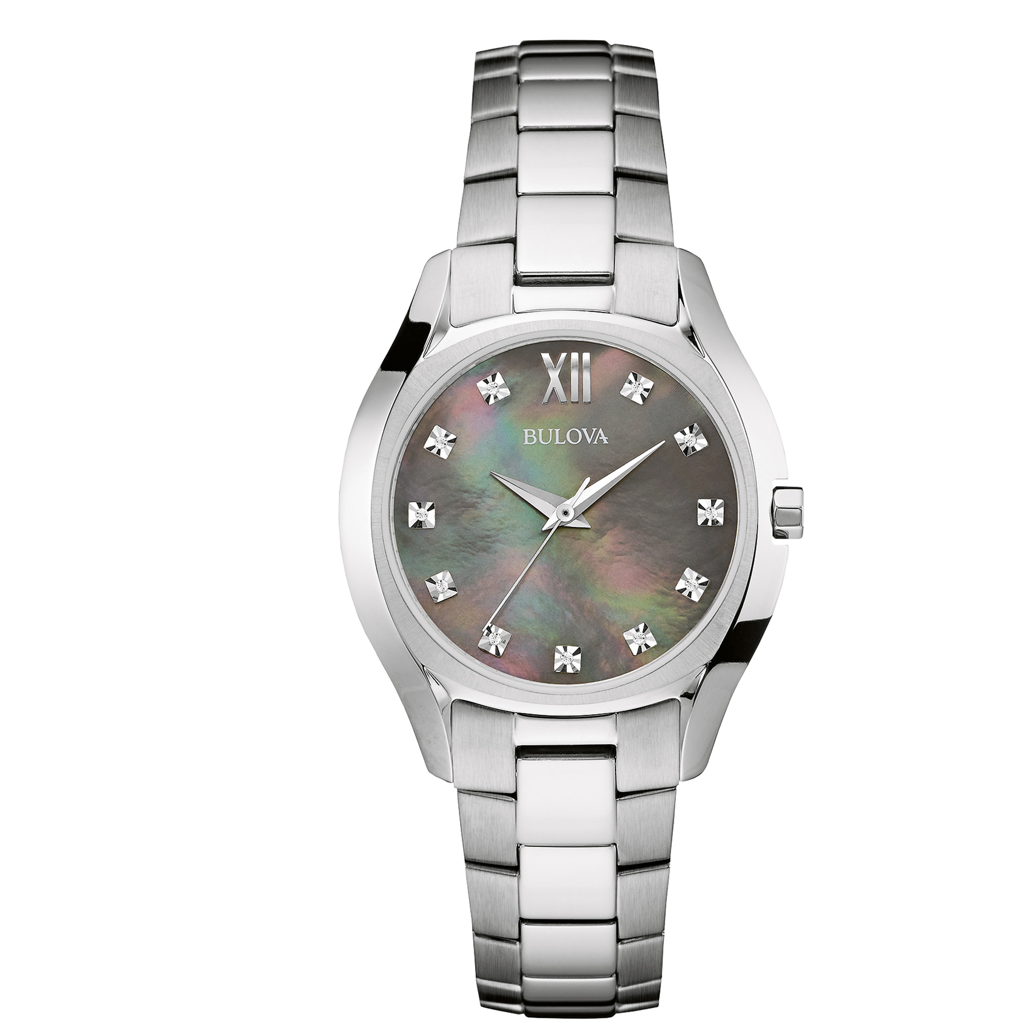 By Bulova. From the Maiden Lane collection. In stainless steel with silver tone case and 11 diamonds individually hand-set on grey mother-of-pearl dial, curved mineral glass crystal, three-hand analog movement, fold-over closure, and water resistance to 30 meters. Diameter: 32.5mm Thickness: 7mm. Please complete box below with engraving as you would like it to appear on your watch.