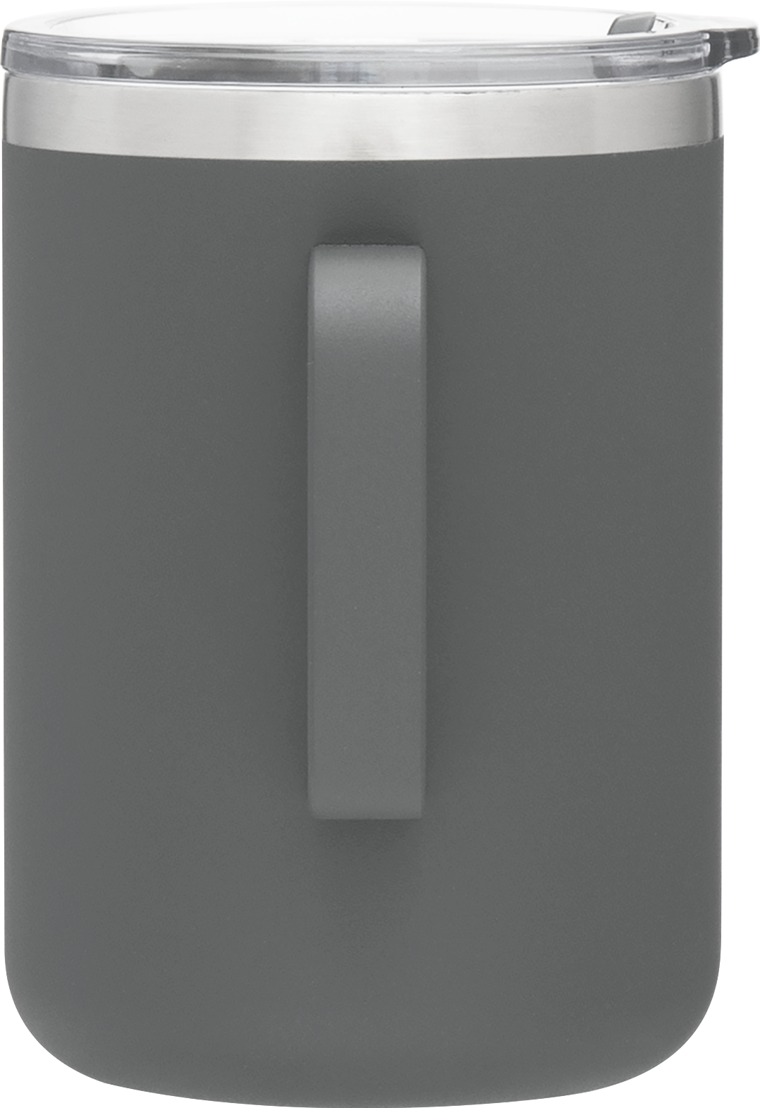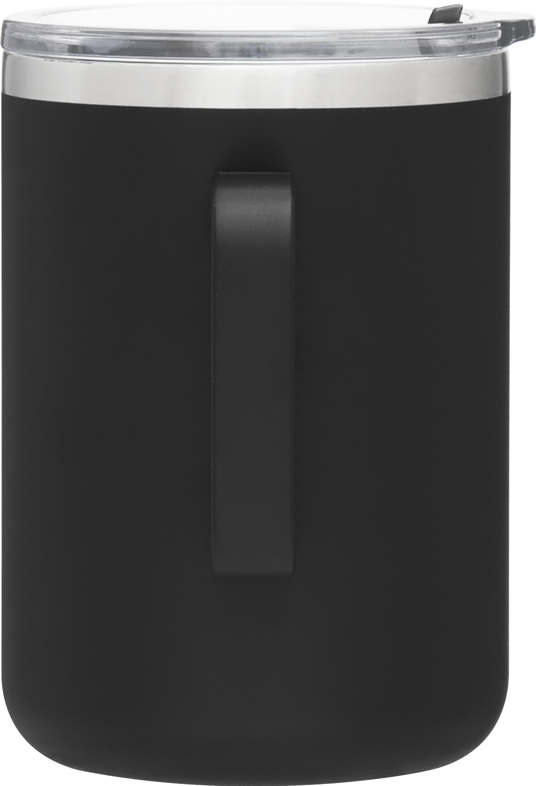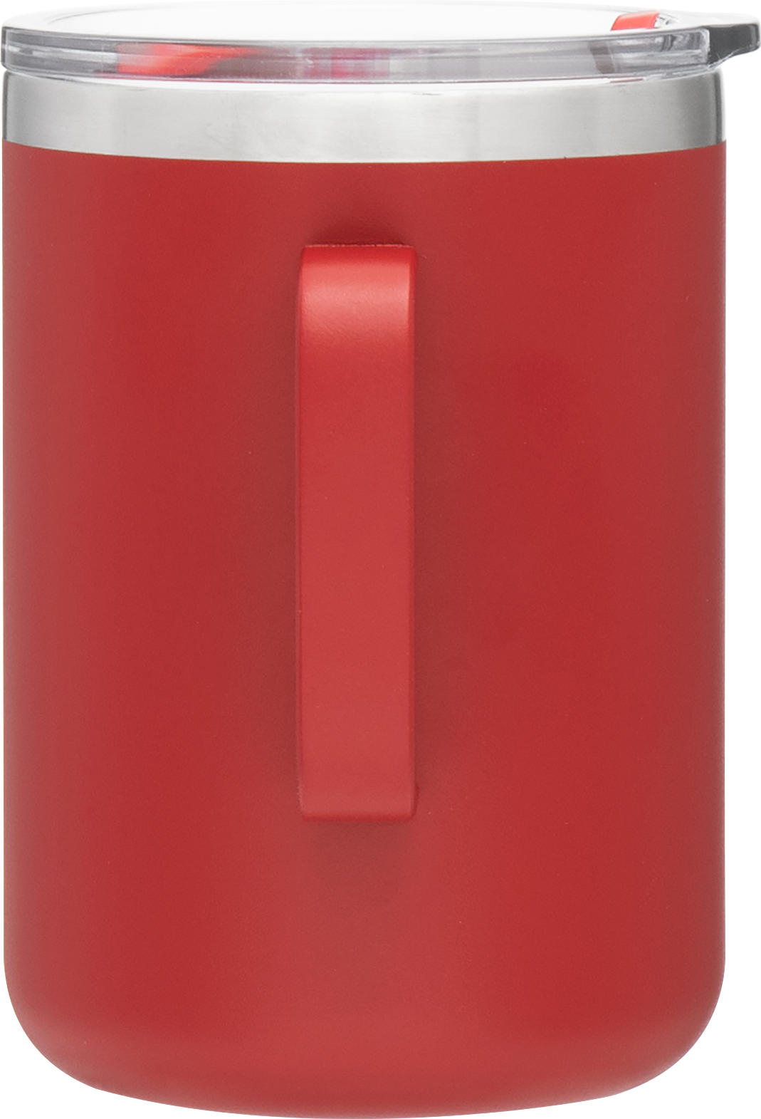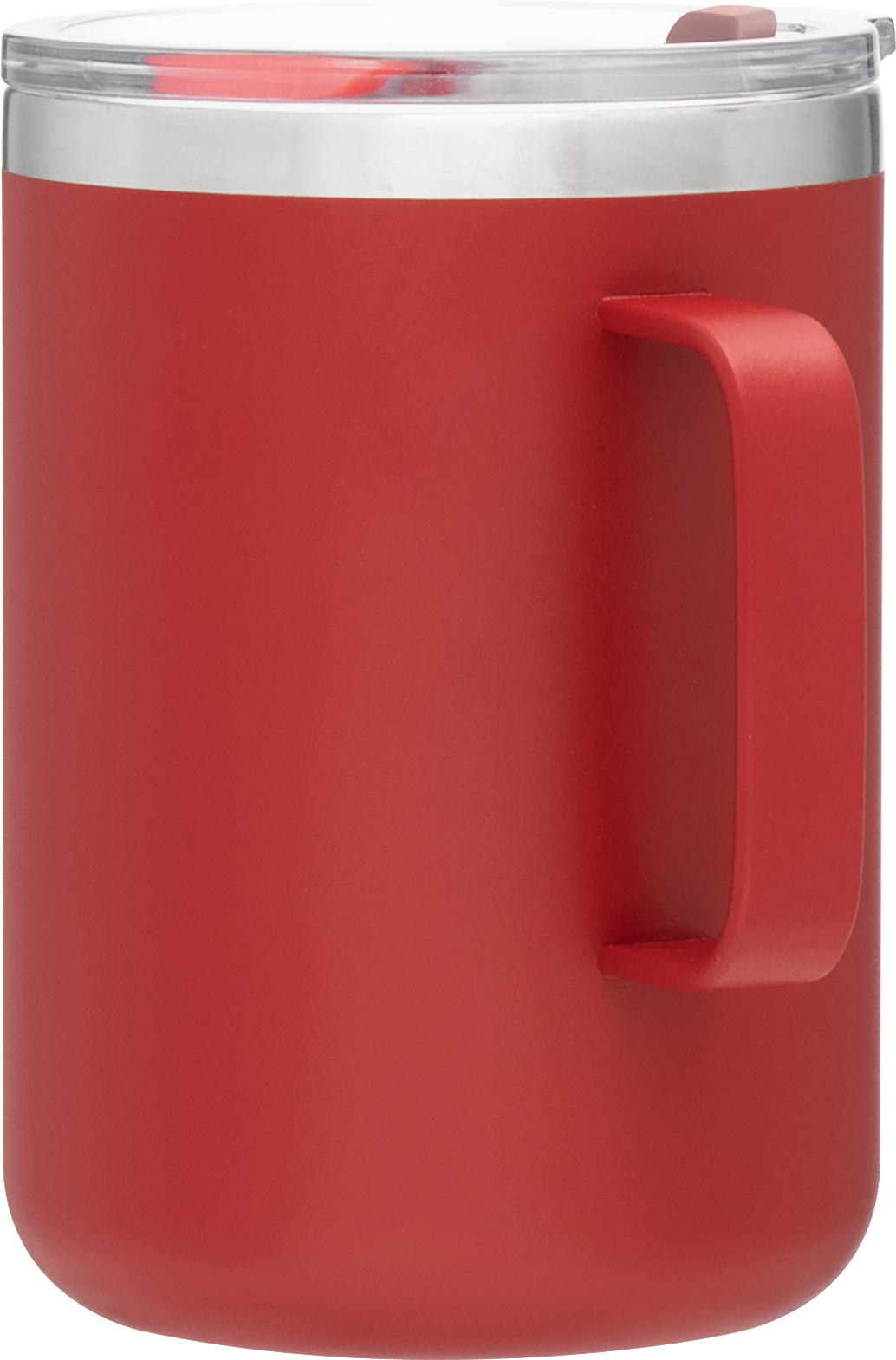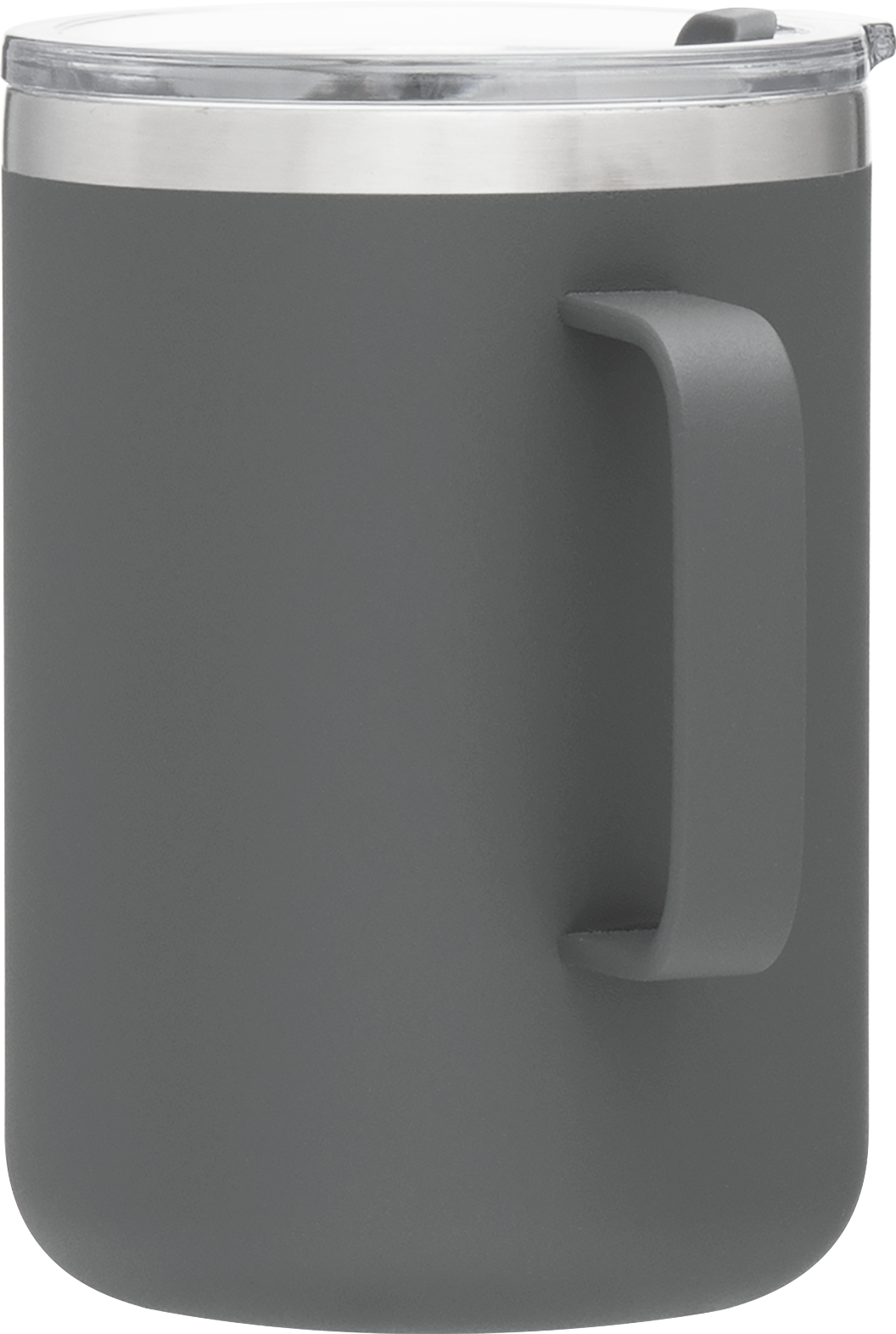 The Camper 16.9 oz thermal mug is designed for outdoor comfort and all-day performance. Made from durable 18/8 stainless steel with double wall construction and copper vacuum insulation, it keeps drinks hot or cold for hours. A clear push-on lid with a matching swivel closure provides spill-resistant sipping, while the stainless steel rim adds a rugged, camp-style detail. Finished with a durable powder coated exterior, it's ready for the trail, the firepit, or your daily commute.